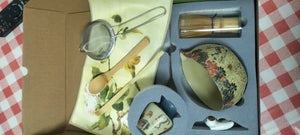 הערכה כוללת: קערת קרמיקה עם פיה, מקציף במבוק, מעמד קרמיקה למקציף, כפית מדידה מבמבוק, כף ערבוב מעץ, מסננת פלדת אל-חלד, מעמד חתול קטן לכפית, ומשטח בד מעוצב.